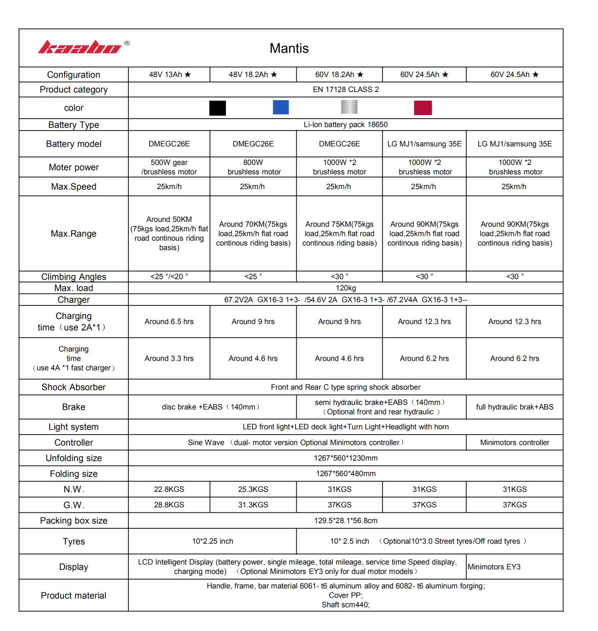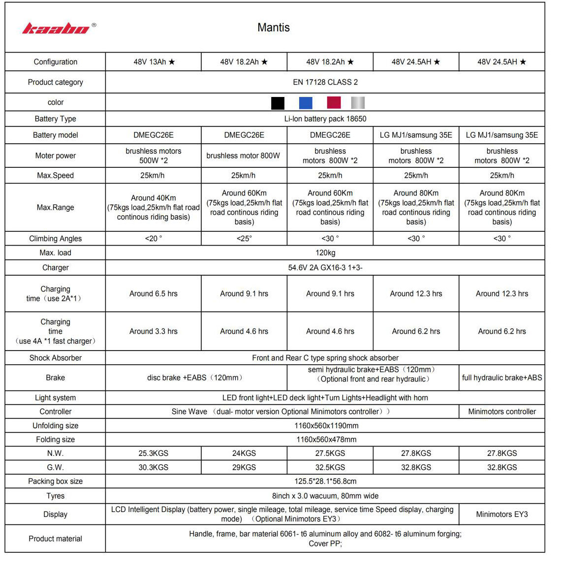 El patinete eléctrico Kaabo Mantix X, insignia de la serie Mantis, destaca por su potencia dual de 2x500W (2200W máximo) y batería Samsung Li-ion 48V 18,2Ah, ofreciendo una autonomía de hasta 75 km. Su diseño integra una suspensión hidráulica ajustable, pantalla TFT, y luces LED diferenciadas. La nueva estructura plegable con doble protección garantiza facilidad y seguridad en el transporte. Equipado con neumáticos 10×3″ y frenos hidráulicos de doble disco, ofrece una conducción estable y segura en diversas condiciones. Certificado por la DGT como VMP, es apto para la ciudad y terrenos off-road, con una carga máxima de 140kg y una velocidad máxima de 25 km/h. Con una garantía de 3 años y certificaciones CE, RoH y CCC, el Kaabo Mantis King GT Certificado redefine la experiencia del patinete eléctrico, ofreciendo rendimiento, comodidad y seguridad de primera clase.