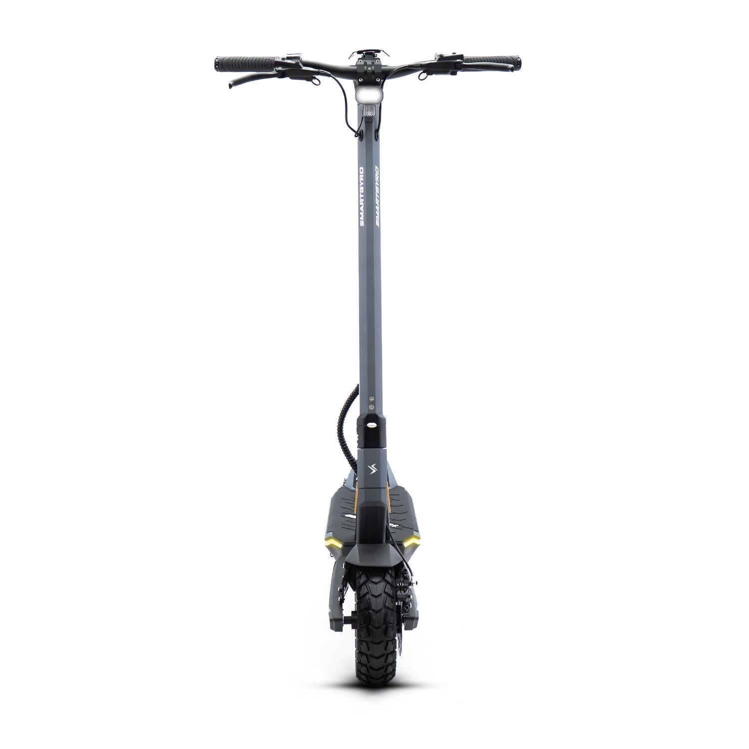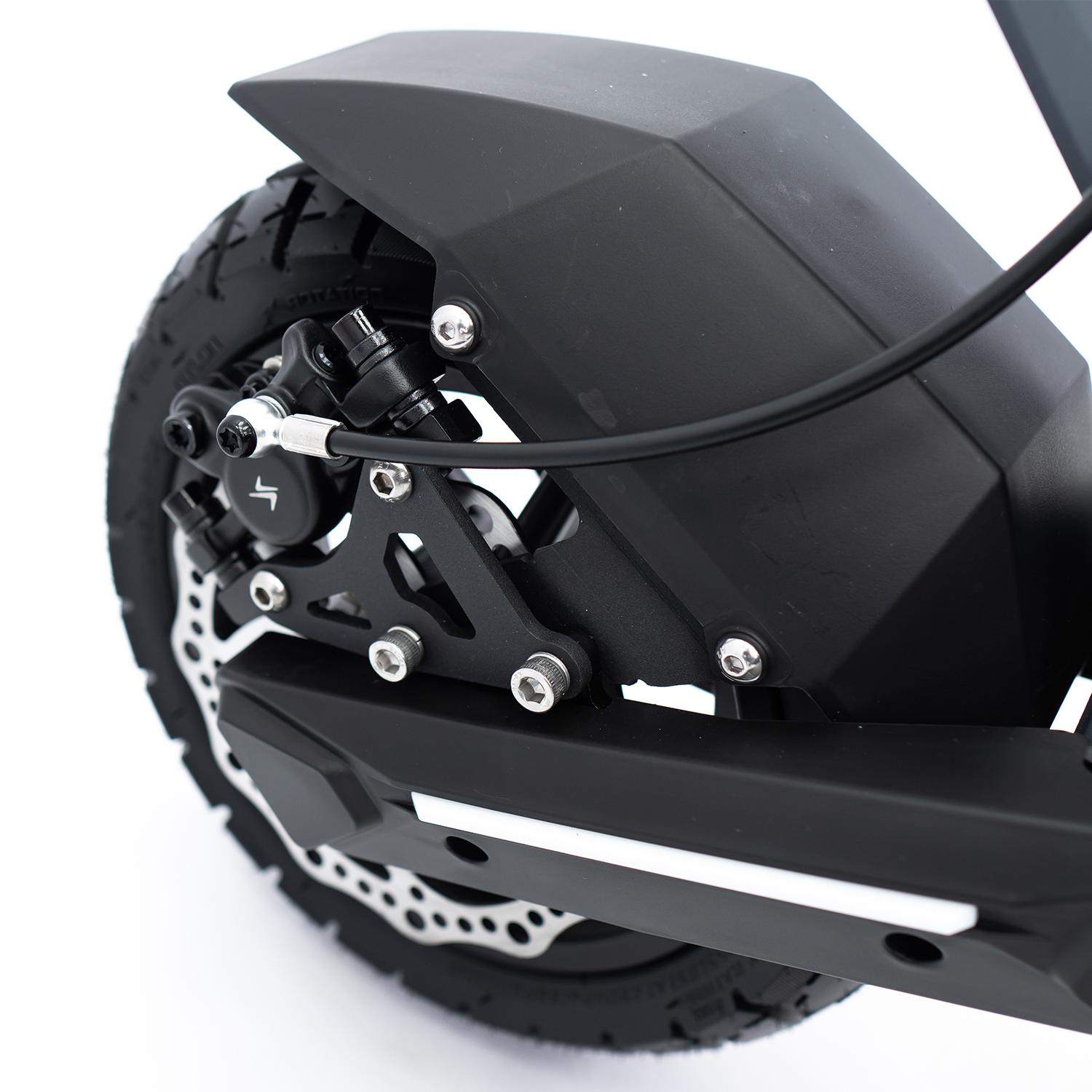 Patinete eléctrico certificado con una potencia máxima de 2000W 48V, batería de litio de 16.000 mAh con hasta 60 km de autonomía, ruedas de 10" neumáticas tubeless, frenos hidráulicos, suspensión delantera y trasera por elastómeros, triple frenada, intermitentes y APP compatible.